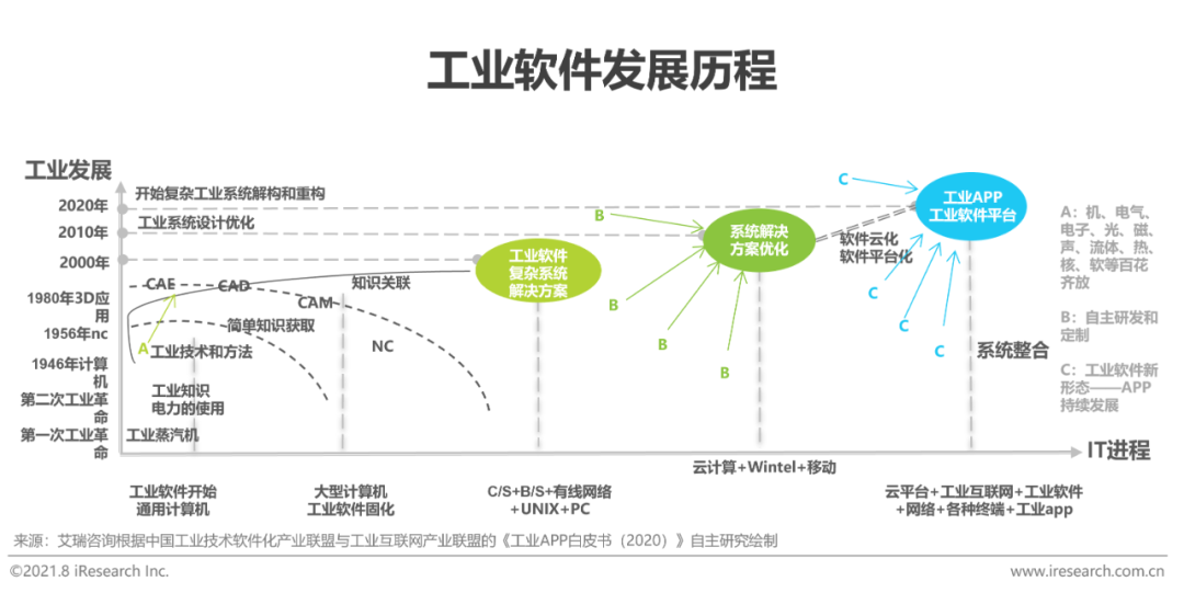 工业软件和应用是工业互联网发挥效能的最为直接和重要的抓手,工业软件的发展离不开最重要也是最核心的汇集了工业生产过程中关键技术、流程、知识、工艺及数据的工业知识数据库支持,传统工业软件厂商经过几十年的产品开发和企业服务,在工业数据与知识、开发经验以及客户资源等方面已经拥有了深厚的积累。在发展自身工业互联网业务时,软件厂商基于原有产品和知识经验的沉淀,打造平台级的SaaS产品和服务,而后将更多精力聚焦于平台与生态体系的搭建与培养,产品和服务的核心在于“平台化”属性,形成软件带动平台搭建,平台带动整体解决方案成型的发展路径。通过构建先进的平台生态业务模式,建立完善ISV 服务体系,通过“Saas+Paas+ISV 云生态”一体化运营,完成从工具型的云化软件厂商向工业互联网平台型企业的转型。面对工业互联网带来的工业软件发展契机,国内软件厂商已经瞄准工业APP这一发展工业软件的新路径,力图缩小一直以来与国际一流厂商的巨大差距,进而赢得更多的市场份额。