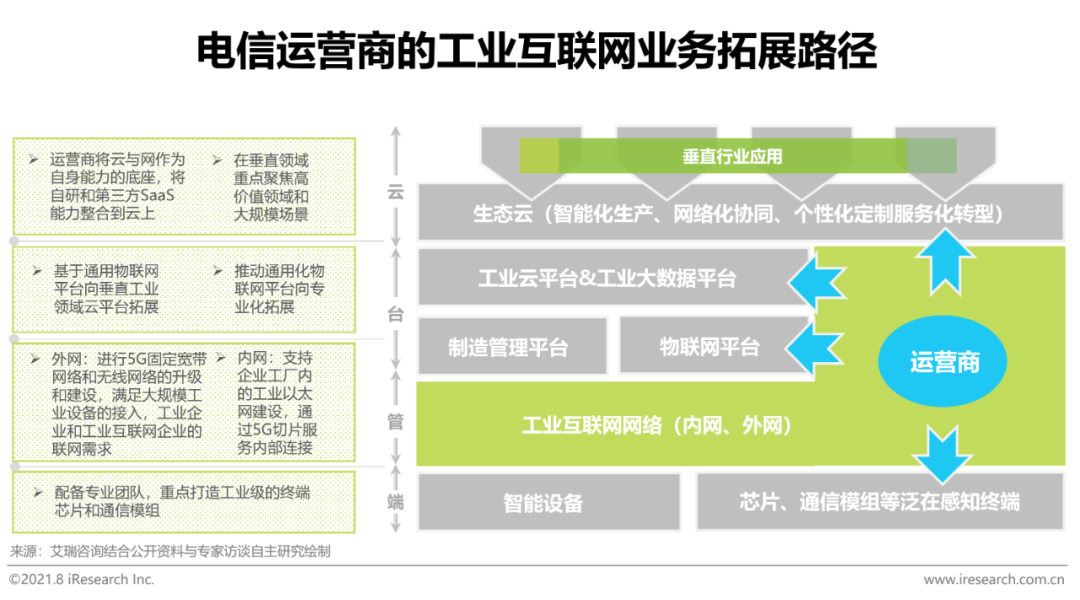 现阶段,我国工业领域网络的性能尚无法高效满足工业数字化、智能化发展的需要,工厂内网改造和外网络建设将成为未来一个阶段工业互联网行业发展的重点领域之一。作为工业互联网的“连接提供者”,电信运营商以5G网络建设为契机,基于自身资源和能力优势从“端—管—台—云”四个方面向工业互联网行业进行切入。在消费互联网时代,电信运营商与网络承载的内容失之交臂,而在当前工业互联网刚刚起步的阶段,运营商对成为产业客户数字化转型使能者势在必得。国内三大运营商均持续加码工业互联网投入力度,打造各自的5G+工业互联网解决方案,根据工信部最新数据显示,目前全国工业企业建设“5G+工业互联网”项目超过1500个,已覆盖22个国民经济重要行业。