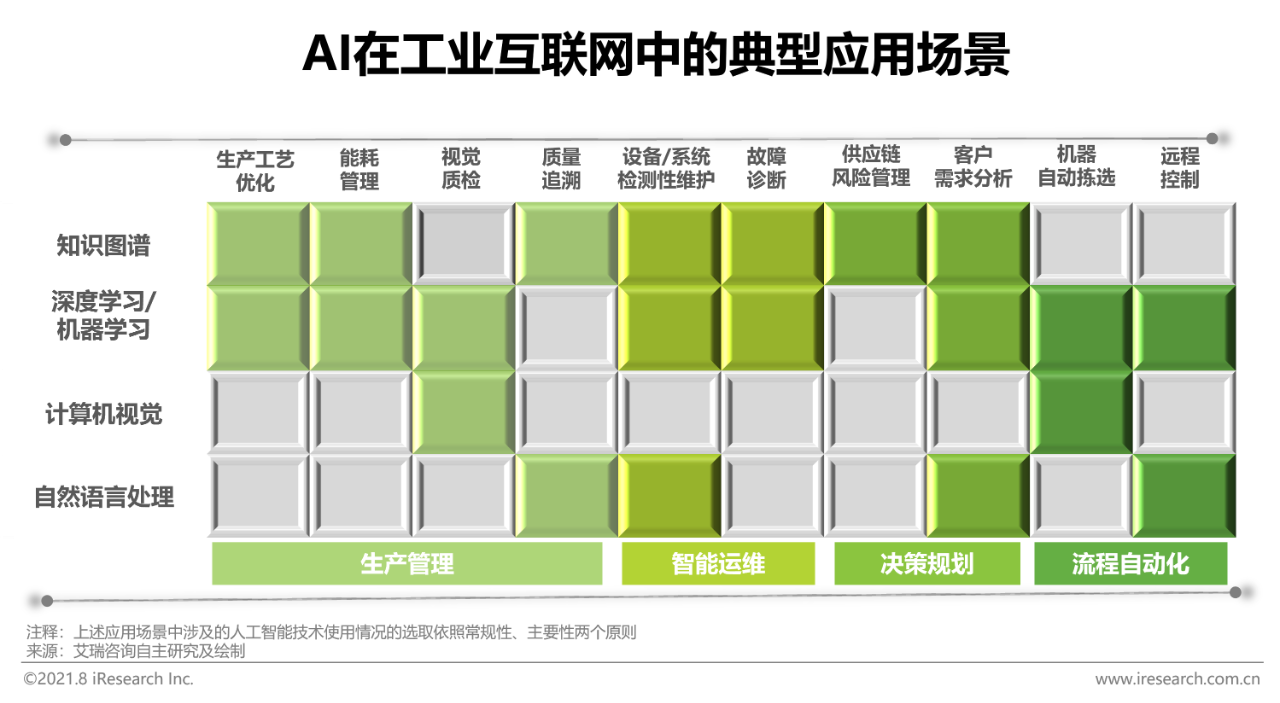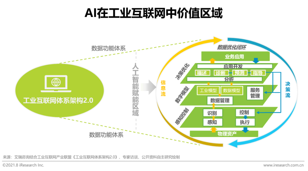工业互联网的核心是数据驱动的智能分析与决策优化,人工智能技术从广义上来看正是一种通过算法模型对数据的处理方式,人工智能技术因此开始进入工业互联网产品建设方的视野,成为服务商拉高产品价值的落脚点。以深度学习和知识图谱的为代表的人工智能技术从根本上提高系统建模和处理复杂性、不确定性、常识性等问题的能力,显著提升了工业大数据分析能力与效率,为解决工业各领域诊断、预测与优化问题提供得力工具,进一步扩大了工业互联网平台可解工业问题边界的深度和广度。人工智能驱动的工业数据智能分析支撑工业互联网实现数据价值深挖掘,强化了工业企业的数据洞察能力,成为打通智能制造最后一公里的关键环节。
