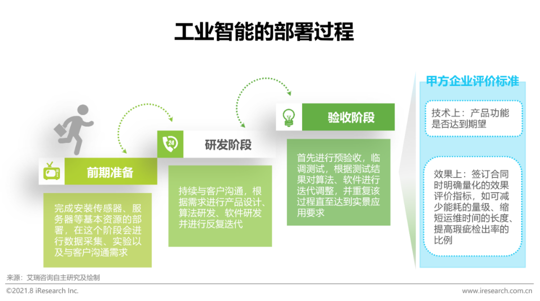 当前人工智能主要通过三种模式融入工业互联网。第一,直接将AI算法或模型嵌入工业互联网平台层,以提升平台层数据分析能力;第二,提供工业AI软件系统,并通过云端部署形成标准化的工业互联网SaaS层应用;第三,提供一套工业互联网框架下包含软件和边缘侧硬件的完整系统。部署过程中会根据行业类别、产品相似度、场景条件、问题共性等因素对不同AI模型进行组合,对同一个行业来说,针对同一个环节将模型尽量标准化以实现移植应用。现阶段工业智能应用以平台侧为主,后期会向边缘侧发展,边缘侧的实时性要求需要AI模型产出的结论与产线或者设备形成控制闭环,艾瑞认为目前我国工业企业自动化程度不一,现场数据质量不高,并且企业对于人工智能的应用较为保守,时下落地较多的应用无论是安全监管还是质量检测都主要集中于平台侧,边缘侧工业智能的下一阶段发展需要配套基础设施和能力的共建。