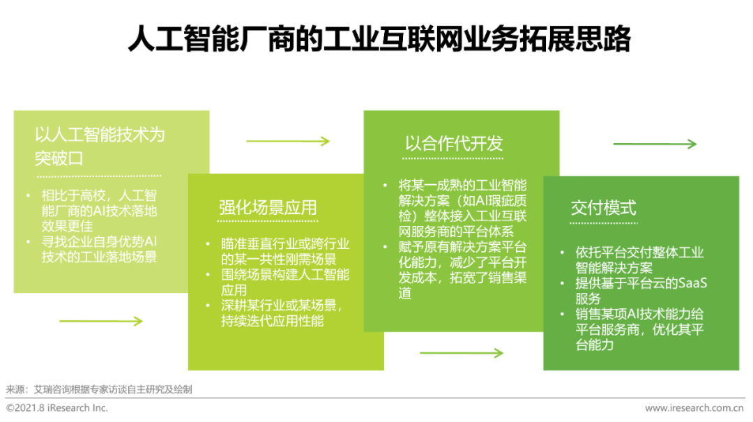 随着《互联网+人工智能三年行动实施方案》、《新一代人工智能发展规划》、《促进新一代人工智能产业发展三年行动计划》等多份国家政策文件的发布,开展人工智能与工业结合应用成为了重要发展趋势。工业领域每个下游行业场景都有其原生的价值链条,同时各个行业的Know – how有着较高的壁垒,人工智能服务商在开展工业领域业务时,大多基于自身技术优势和特点去寻找适合实景落地的垂直细分行业或者某一共通性工业场景,在特定场景应用中持续打磨自身工业智能产品和服务。“聚焦”被大多数AI厂商视为优先的发展策略,通过与成熟的工业互联网平台型企业开展合作,以融入而非自主开发的方式获取平台能力,不仅极大地减少了自研开发的成本和风险,而且为迭代、优化、创新自身工业智能解决方案提供了丰富的资源储备。