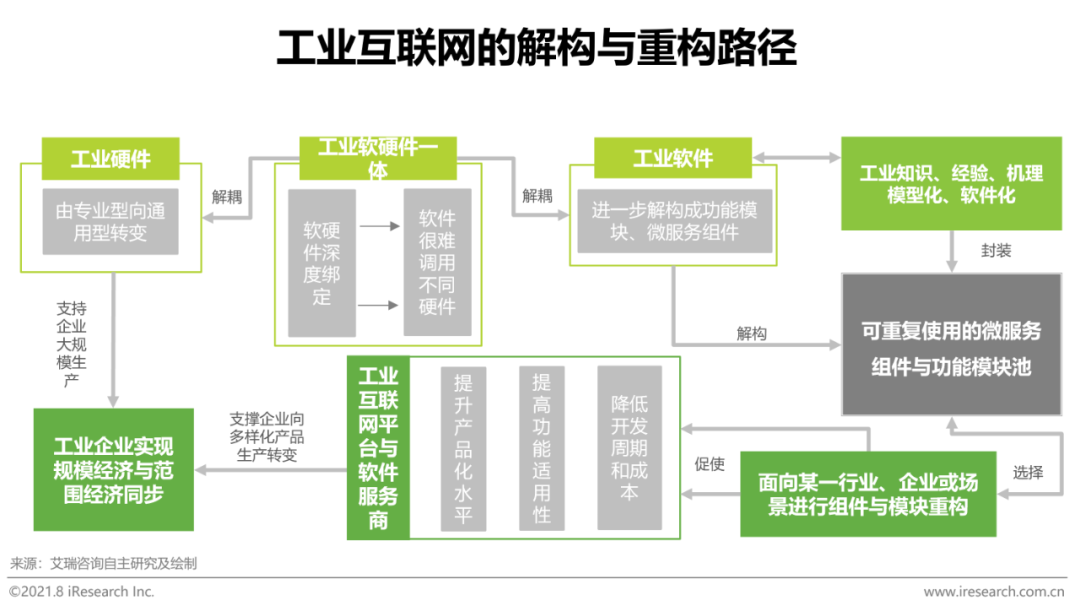 如前文所述,工业互联网在解决实际问题时首先就要面对工业领域繁杂多样的细分行业与企业需求,当下服务商多采取为工业企业提供定制化的专有产品的服务方式,产品的低可复制性与移植性严重制约服务商的服务效率与商业回报,同时,工业企业也需要灵活便捷的数字化系统来平衡规模化生产与个性化需求之间的矛盾。针对上述问题,本身具备松耦合架构特点的工业互联网将进一步解耦工业软硬件、解构平台与软件,形成以功能模块和微服务组件为能力单元的平台构建基础,未来工业互联网平台与软件将由自己的一个个可复用的“乐高组件”重构成为满足各类型企业和多样化需求的开放系统。