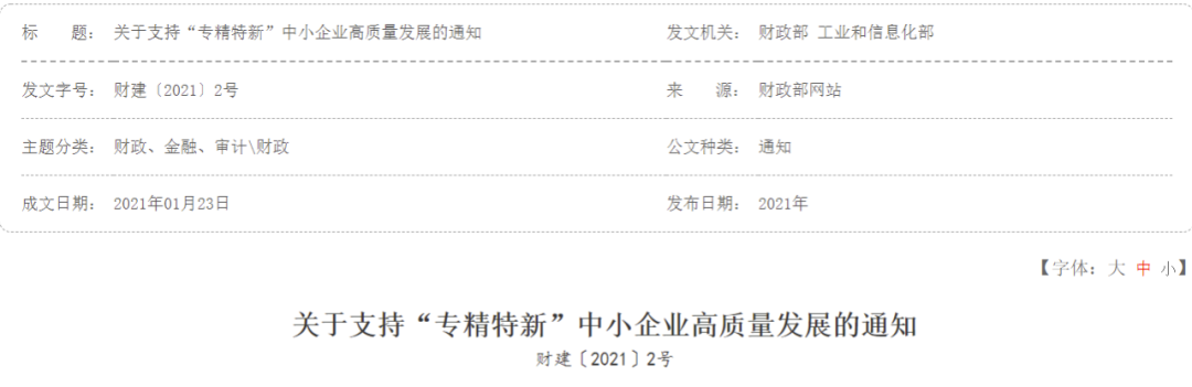 2021年1月23日,财政部、工业和信息化部联合印发《关于支持“专精特新”中小企业高质量发展的通知》,启动中央财政支持“专精特新”中小企业高质量发展政策。为让企业对申报相关事宜有更深入的了解,现对各地申报认定“专精特新”政策进行汇总。