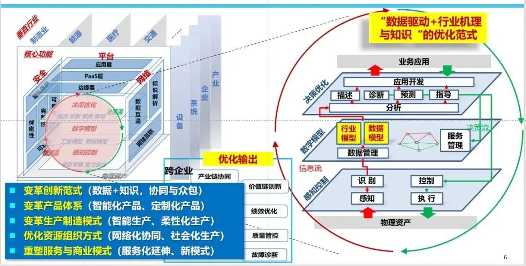 “数据驱动+行业机理与知识”的优化范式是数字化转型的一个基本范式和方法论。这种优化范式体现在设备、车间、企业和跨企业等不同层面的输出,可以形成创新范式的变革、产品体系的智能化、生产模式的自动化,还有资源组织方式,包括商业模式的创新,从而构建当前数字化转型的一些基本面。