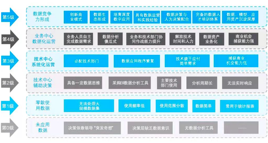 目前,已有企业实现PLM、CRM、ERP等业务系统间的信息集成和数据交互,但这只是数据应用中的一环,与充分利用数据改善管理、降本增效、实现创收的目标还有很大距离。企业数据使用水平,可参考图2测评自身处在哪个级别,从而制定相匹配的数智应用开发方案,开发能够产生直接价值的数智应用。