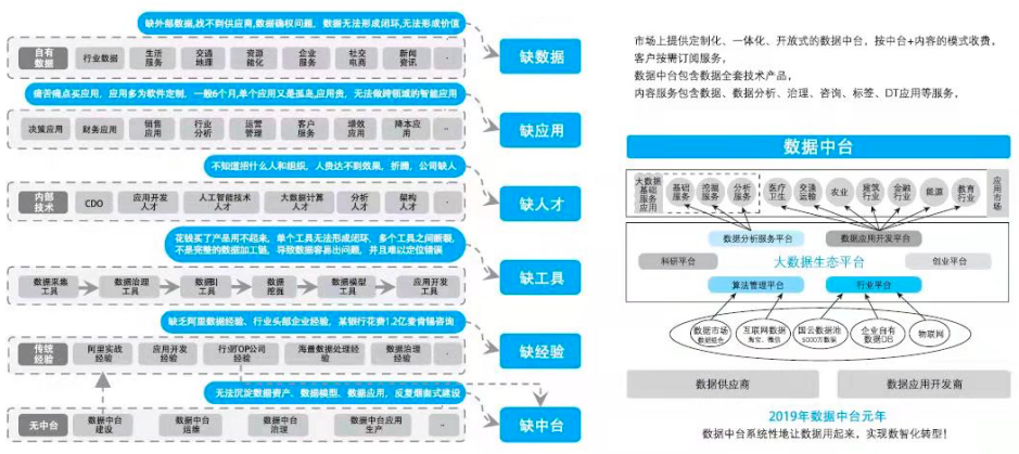 第六是中台。数据中台是企业数字化转型的核心内容,企业不搭建数据中台便无法顺利进行数字化转型。面对业务和管理问题时,一味地增设应用却不建设数据中台,又会导致重复建设的情况,造成数据烟囱林立,内外部数据无法实现共享和打通,也就无法沉淀数据应用能力。