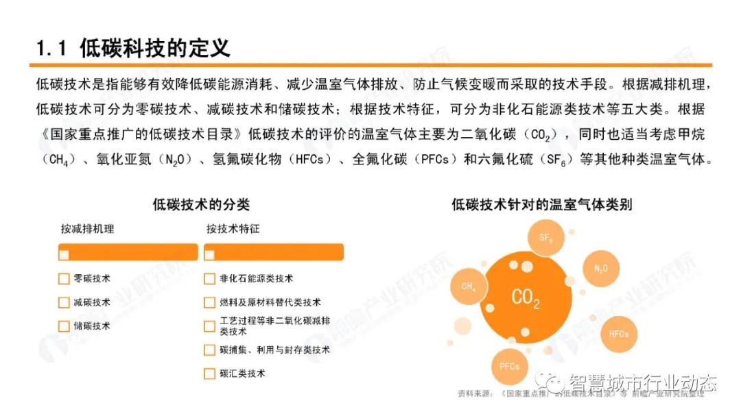 低碳技术是指能够有效降低碳能源消耗、减少温室气体排放、防止气候变暖而采取的技术手段。根据减排机理,低碳技术可分为零碳技术、减碳技术和储碳技术;根据技术特征,可分为非化石能源类技术等五大类。根据《国家重点推广的低碳技术目录》低碳技术的评价的温室气体主要为二氧化碳(CO2),同时也适当考虑甲烷(CH4)、氧化亚氮(N2O)、氢氟碳化物(HFCs)、全氟化碳(PFCs)和六氟化硫(SF6)等其他种类温室气体。