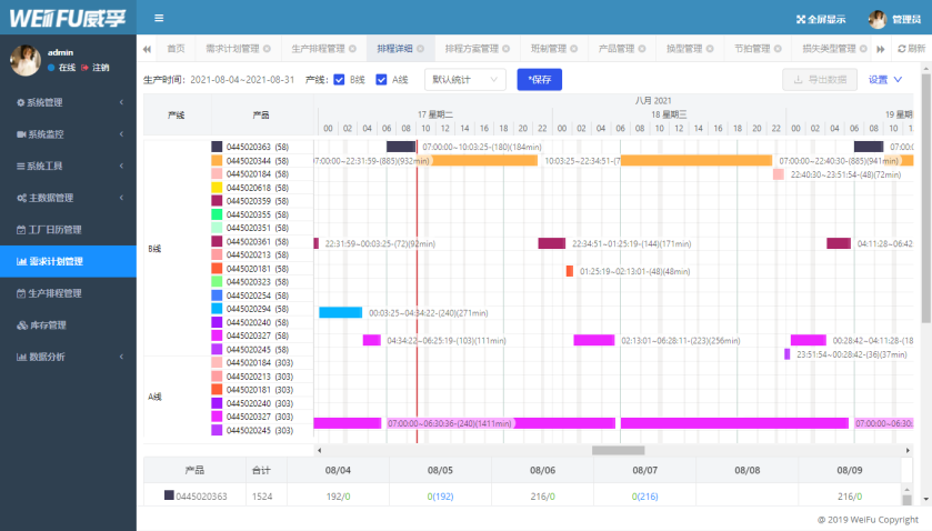 通过排程算法,对生产计划进行自动排程,并整合生产系统的生产过程参数,实现对生产过程的自动或手动的规划过程。排程算法根据生产计划中的需求产量、主数据中定义的排程方案、工厂日历等约束条件进行排程计算,通过多次迭代计算最优结果。通过选择不同的排程方案的组合方式来满足生产计划。排程结果则以甘特图和统计表格的方式显示,在甘特图中可以对排程结果进行修正或编辑。