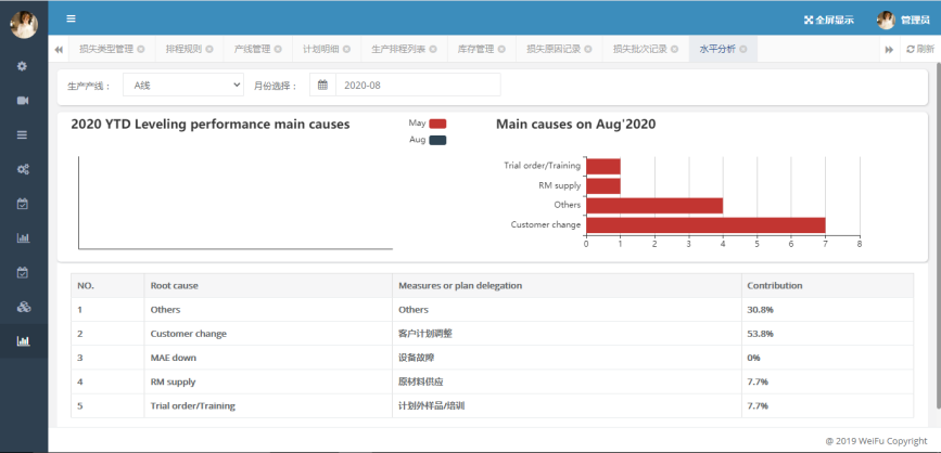 从水平分析和均衡表现两方面统计排程的结果以及排程调度的执行情况。水平分析是生产负责人和计划人员对造成排程调整的原因进行统计分析,作为生产过程优化的依据。均衡表现是通过生产过程统计产出与排程结果的偏差进行分析,判断生产过程是否按照预期计划进行执行。