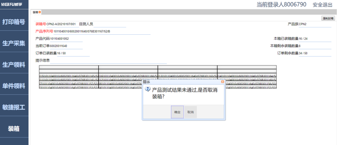 在产品包装下线报工时,生产系统针对每个产品测试结果从测试台数据库里抓取测试数据并进行判断,如有测试数据不合格或无测试记录,则无法正常报工。