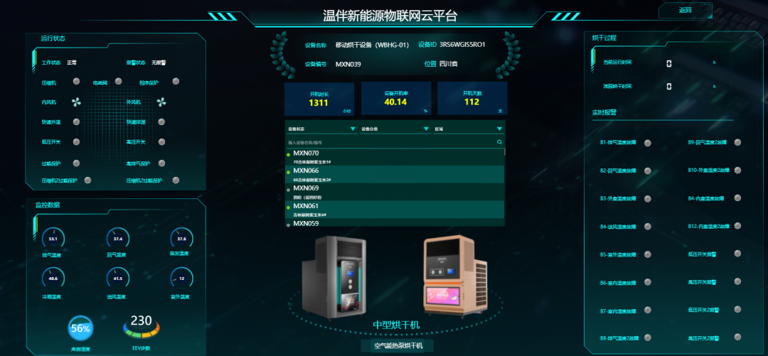 ▲共享烘干机平台界面经过安装调试,村民可以通过设备控制面板或者手机APP给设备下达指令,完成红薯等农作物的脱水,桑葚、柠檬等水果的初加工,以及腊肉腊肠的烘干流程,大大方便了生产生活。此外,通过连接平台,村两委可以实时监测设备情况,保障设备安全使用。