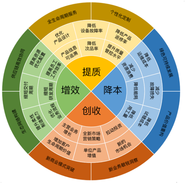 图1工业设备生命周期二、工业设备数字孪生技术应用价值模式工业设备数字孪生技术创造的价值功能,除了满足企业已经存在的需求外,还将带动新需求,拓宽企业视野,打破市场边界,衍生新兴产业。当前,工业设备数字孪生技术应用应以价值实现为最终目的,我们从价值本质和应用对象两个视角出发,总结工业设备数字孪生技术应用价值。(1)价值本质视角当前工业设备数字孪生技术对企业的四个价值本质体现在:提质、降本、创收、增效。紧紧围绕价值本质数字孪生技术为企业创造价值,赋予企业价值理念。