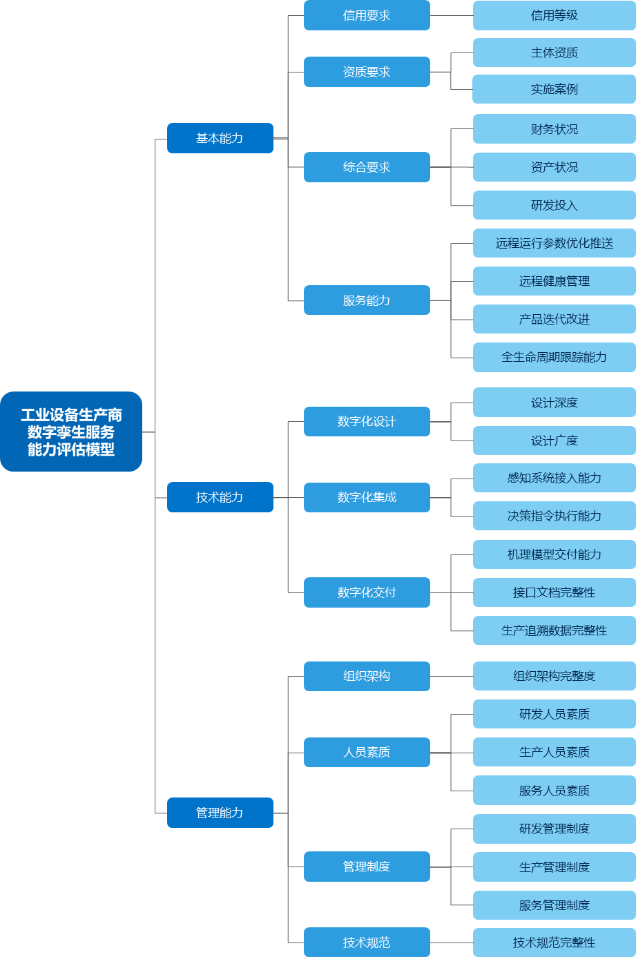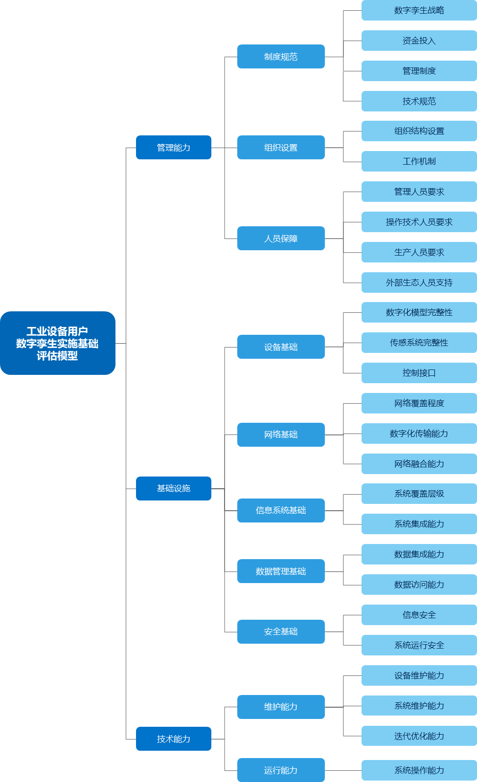 图5数字孪生应用成熟度等级需要注意的是:j工业设备数字孪生应用成熟度是工业设备数字孪生实施深度的综合判定,聚焦到某个单点的评估并不一定是完全满足对应层级的指证。k企业在实施数字孪生过程中层级是可跨越的,不一定要循序渐进,可根据企业自身的基础和战略制定符合自身的实施路径。l数字孪生技术的实施应以满足企业自身应用需求为目标,成熟度等级是企业评估自身现状、项目成效、差距分析的参考依据,并不代表绝对优劣,企业应用该模型时可以根据自身情况进行扩展或裁剪。四、工业设备数字孪生系统实施条件成熟度评估工业设备生产商和工业设备用户是工业设备数字孪生系统主要的实施对象,数字孪生系统开发商则是实施的主体,三方需共同合作评估数字孪生系统落地应用的自身条件。本书制定了面向工业设备生产商数字孪生服务能力评估模型、面向工业设备用户的数字孪生实施基础评估模型以及数字孪生系统开发商的服务能力评估模型等三个评估模型,适用于评价工业设备数字孪生实施准备工作,帮助企业明确数字孪生实施路线,分析诊断实施基础差距,从而进一步明确实施路径。(1)工业设备生产商数字孪生服务能力评估模型工业生产商评估模型旨在评估工业设备生产商提供数字孪生服务的基础能力。以应用需求为导向,分别从基本能力、技术能力和管理能力3个维度进行评估。