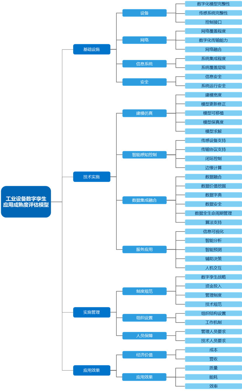 图3数字孪生应用对象视角价值模式三、工业设备数字孪生应用成熟度(1)工业设备数字孪生应用成熟度评估模型工业设备数字孪生应用成熟度评估模型旨在评估工业设备数字孪生系统实施后的实施深度和成效。以应用需求为导向,根据评估模型中基础设施、技术实施、实施管理和应用成效四个方面评估。
