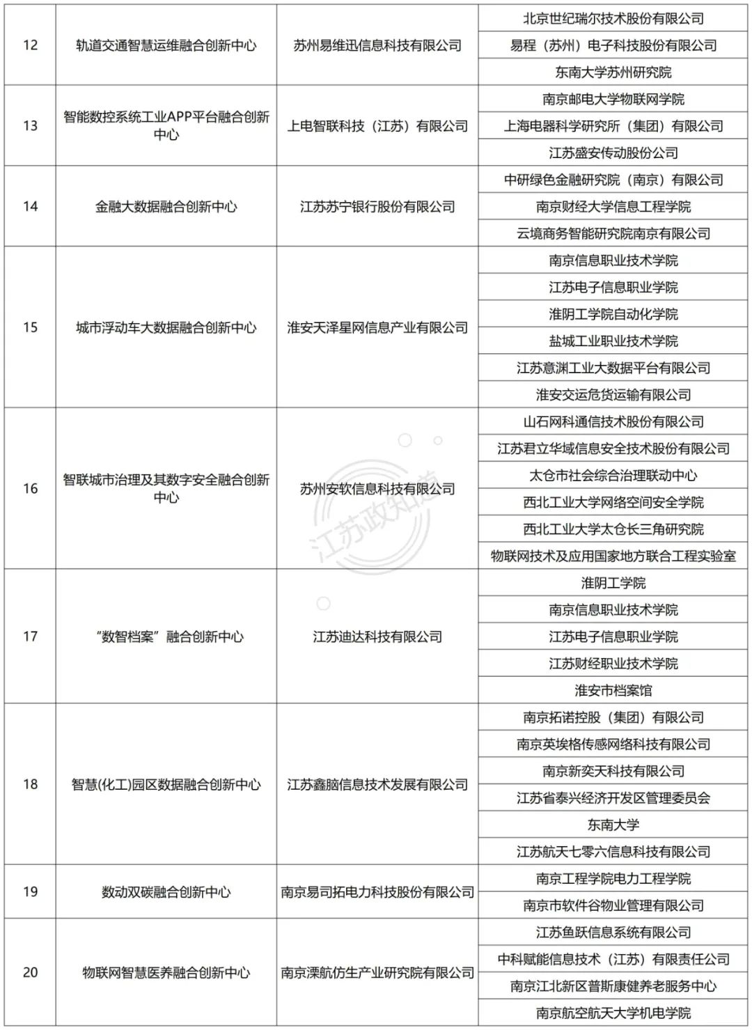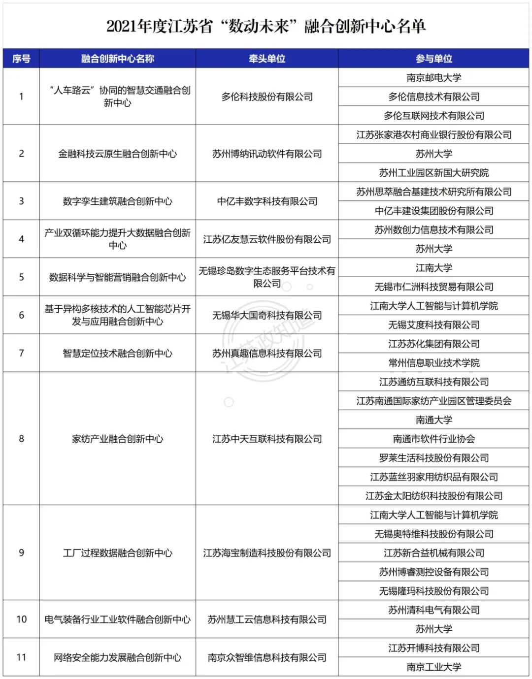 为贯彻落实国家大数据发展战略,根据《江苏省强化大数据引领推动融合发展专项行动计划》(苏经信软件〔2018〕498号)关于“创建江苏省‘数动未来’融合创新中心的工作任务”,我厅组织开展2021年度江苏省“数动未来”融合创新中心评估工作。根据《江苏省“数动未来”融合创新中心评估规范》,经企业申报、地方推荐、专家评审等环节,现将评估结果进行公示,请社会各界监督。
