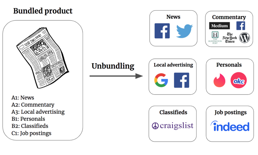 媒体分析师Thomas Baekdal认为新闻是一个独立的产品。过去,报纸提供一系列复杂的捆绑服务,有广告、填字游戏等等,而这些服务中的大多数现在已经变成了独立的业务,也就是实现了自身的解绑和独立。因此,现阶段传统媒体自身面临的挑战是如何将新闻内容货币化。