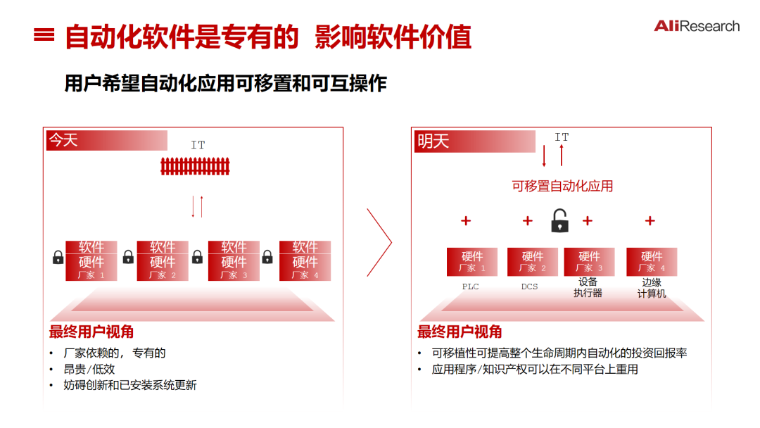 迎接开放自动化新时代。OT系统原有专用封闭的控制系统和软件,与硬件深度绑定,软件在不同硬件之间很难移植,即使同一个厂商、不同硬件产品也面临同样的问题,这是制约IT系统跟OT系统融合、制约企业对需求实时响应的瓶颈。今天,自动化控制系统正迎来一场新的革命——开放自动化革命。这是一场底层技术的变革,软硬一体化的自动控制系统正在不断解耦,一个高度依赖专有系统、低效系统、昂贵系统,更新缓慢的系统,正演进到一个能够对客户需求快速响应、柔性制造能力更强的一个系统;传统专有、低效率的封闭控制系统,正在向即插即用、开放自动化系统演进,这将带来了自动化工程设计、实施、运营的高速度、敏捷性、灵活性和高效率,也会带来控制技术体系乃至生产运营体系的变革。