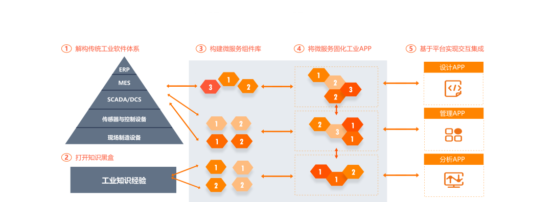 展望未来,我们看到OT系统和IT系统正在解构、重组。无论是控制系统,还是MES、ERP、SCM、CRM等系统正在解构成各种微服务组件,工业知识经验被封装成微服务组件,构建起一个微服务池。基于微服务池,可以封装成各种面向角色、面向场景的应用。当一个汽车刹车片需要召回的时候,传统方式是在多个系统中翻箱倒柜找各种信息并进行决策,谁设计的?谁生产的?什么图纸?在哪生产的?库存有多少?价格是什么?这些信息散布在各种不同业务系统中。今天,如果构建了这样的平台,即可快速封装成一个面向角色、面向场景的APP,解决快速响应的问题。从传统的系统集成到微服务集成提升应用可复制性。