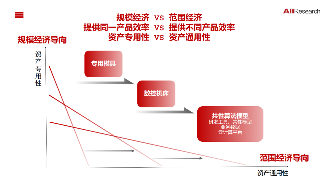 软硬解耦的经济学意义在于,实现规模经济与范围经济的最大化。可以从规模经济与范围经济的视角来理解“软硬解耦”。规模经济源自资源的不可分性、资产的专用性和沉没成本等,范围经济由多样化经济活动的协同效应所带来的资源的高效利用。工业时代企业的资产大多都是专用资产,一种资产只能从事某种产品的生产和价值创造,资产的专用性带来了规模经济。个性化需求本质上是考验企业范围经济的能力,就是一个企业生产和提供不同产品的能力。从规模经济走向范围经济,就企业内部来讲,核心能力就是把企业资产从专用资产转化为通用资产,从专用模具到数控机床,到共性算法模型、研发工具、数据平台等。只有企业拥有更多的通用资产,才能形成自己的范围经济,构建提供不同产品和服务的能力。今天,无论是单机智能、还是系统智能,核心都在于对外部需求的变化的做出实时响应,技术的逻辑在于软硬解耦后,以可编程的软件服务满足不断变化的需求;其经济的逻辑在于,让硬件遵循规模经济,让软件遵循范围经济。
