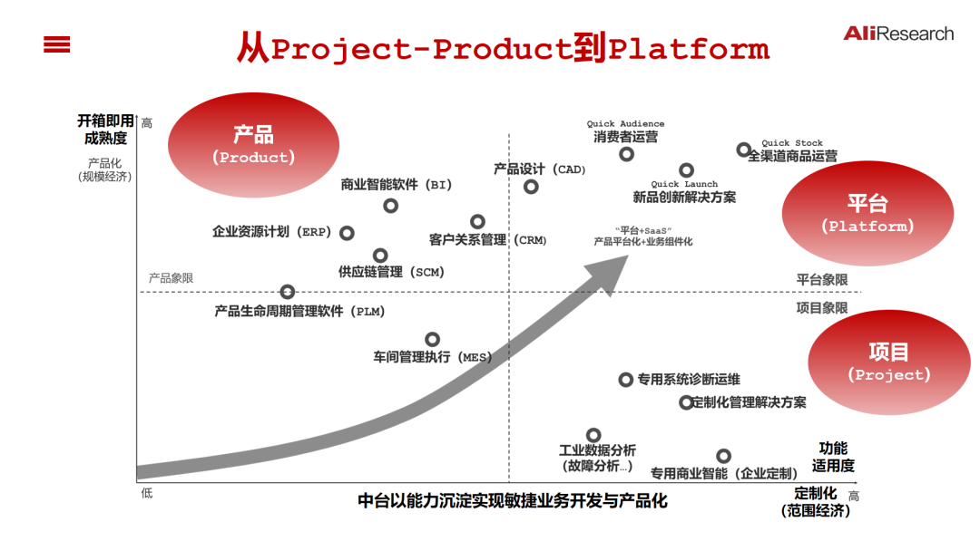 工业互联网平台能力迭代的核心是如何实现“Project—Product—Platform”的转化,以及转化的速度、效率和服务能力。工业互联网平台正成为能力复用的载体,今天不同垂直行业中雨后春笋般的涌现出了各种平台,如果我们从长周期的视角来看,如何评估工业互联网平台核心能力,一个重要的观察视角是如何通过做一个个项目(Project),沉淀成通用的软件产品(Product),并将这些产品以平台化(Platform)的方式来开发、部署和运营。我们可以从两个角度去衡量和评估软件系统的功能。一是产品化水平,开箱即用的成熟度。二是产品功能对企业的适用性。现实的情况是,许多复杂套装软件产品化程度很高,但部署、运营、二次开发成本很高,产品的适用性差;企业自己独立开发多个项目及专有软件适用性很强,但开发成本比较高、可复制性、可移植性比较差。今天,面向复杂多变的市场需求,企业既需要产品开箱即用,也需要与企业特定需求高度适配,这是工业互联网所要解决的根本问题。企业需要把项目能力沉淀为产品能力,把产品能力以平台化的方式来部署运营。考察评估一个工业互联网平台最重要视角是,如何能够把一种项目变成一个产品,把产品变成一个平台化能力。