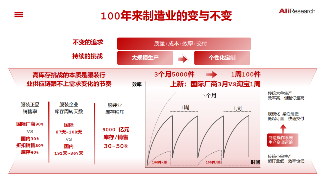 犀牛智造:以端到端智能优化实现供需精准匹配。阿里犀牛智造在过去几年所探索的,就是在一个传统行业中如何实现从单机智能到系统智能,如何实现端到端的全链路智能。多年来,服装行业一直不能很好解决库存问题,国内企业库存占销售30%-50%,每年近万亿元;中国服装企业库存周转效率比国际公司低一倍;正品销售率不到国际公司的一半。这是制约企业提高利润率的重要瓶颈。同时,需求越来越碎片化、场景化。解决这一问题,需要将一个上万件、三个月交期的大订单,转化为淘宝平台上100件、一周交付的小订单。挑战在于如何实现快交付的小订单的研发、设计、生产、供应链的效率不打折,这正是犀牛智造所要解决的问题。核心是构建一个基于云端的全流程、全生命周期的资源优化体系。