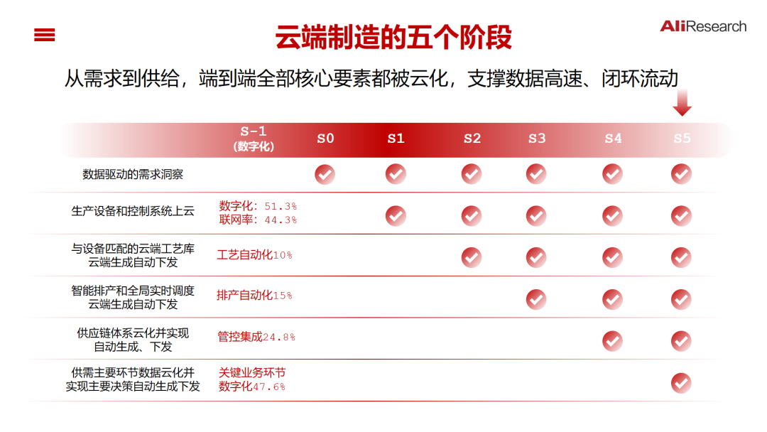 犀牛智造:云端算法定义的在线工厂。面对服装行业高库存、个性化、短交期的需求,面对制造业端到端全局优化的新形势,只有云架构才能够实现全链路的资源优化,制造体系从单机设备、生产线、车间工厂的智能化,走向需求感知、设计研发、工艺优化、生产计划、制造执行、供应链配送的全要素、全局智能,从智能制造走向云端制造,构建面向平台商家的制造服务解决方案。犀牛智造的本质是构建了云端算法定义的在线工厂,完美地阐释了如何从单机智能到系统智能,如何将“硬件通用化,服务可编程”拓展到整个制造体系。阿里过去几年在服装行业持续探索系统化解决方案,核心是基于云边协同的技术架构,将传统封闭、孤立、内部资源优化导向的软件系统改造成一个开放、云原生、体系化的行业解决方案,面向端到端资源优化,实现产品设计、生产工艺、排产计划、制造执行等决策指令的云端生成、云端下发、边缘执行。云端制造演进的5个阶段。经过多年发展, 中国服装行业智能化水平不断提高:领先企业生产设备的数字化达到51.3%、联网率达到44.3%,关键业务环节实现数字化的达到47.6%、工艺实现自动化的达到10%、排产计划实现自动的15%、管控实现集成的24.8%。这些数字化的改造是必要的,但对于今天端到端的资源优化而言是远远不足的,需要端到端各种生产要素的云端汇聚和优化,这种云端制造可以分为5级。云端制造S1级:需求来自于云端,来自于客户的数字化平台,企业能够基于数字化需求洞察行业趋势,开展新产品开发。同时,企业实现了所有相关设备数据云端汇聚和指令下发。云端制造S2级:不仅生产设备数据上云,而且与设备、产线匹配的工艺,可以实现云端生成并自动下发。云端制造S3级:基于数字化工艺,企业能够基于特定工厂的生产要素资源,实现智能排产计划、车间制造资源及车间物流等优化决策指令的云端自动生成、自动下发。云端制造S4级:企业不仅实现了研发设计和车间生产决策体系的云端生成与下发,而且实现了整个上游供应链体系优化决策的云端自动生成、自动下发。云端制造S5级:实现了云端优化供需主要环节生产要素数据云化,以及主要决策自动生成下发,实现端到端数据自动流动以及全生命周期资源优化。