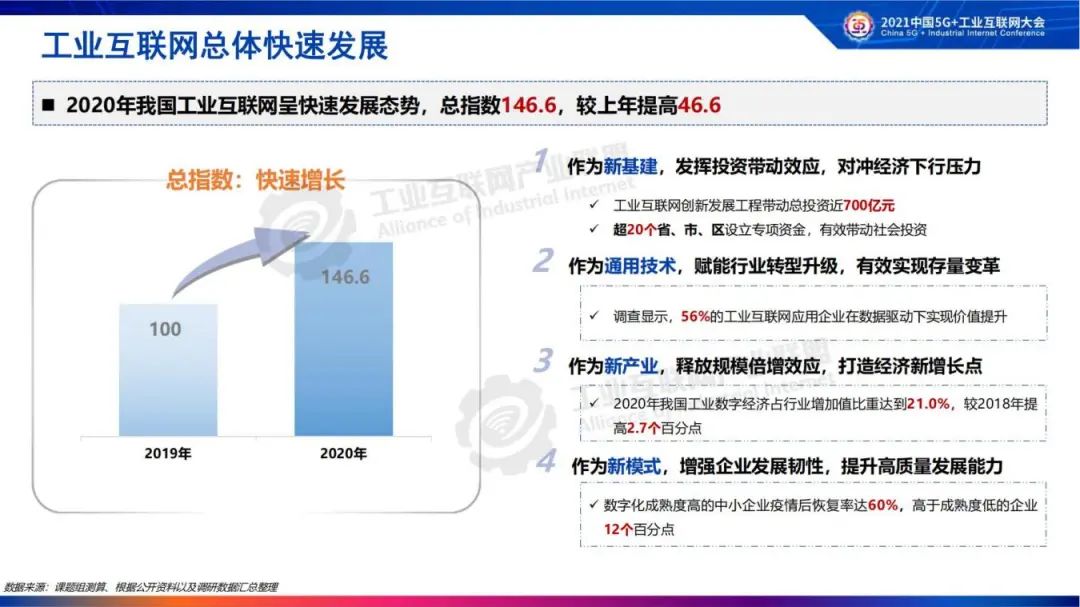 《报告》分析了工业互联网发展总体态势,2020年我国工业互联网总指数为146.6(2019年为基期100),较上年提高46.6。2020全年,我国工业互联网快速成长,日益成为我国新时期高质量发展的重要动力。工业互联网作为新基建,有效发挥投资带动效应;作为新模式,有效增强企业发展韧性;作为通用技术,有效赋能行业转型升级;作为新产业,有效打造经济新增长点。