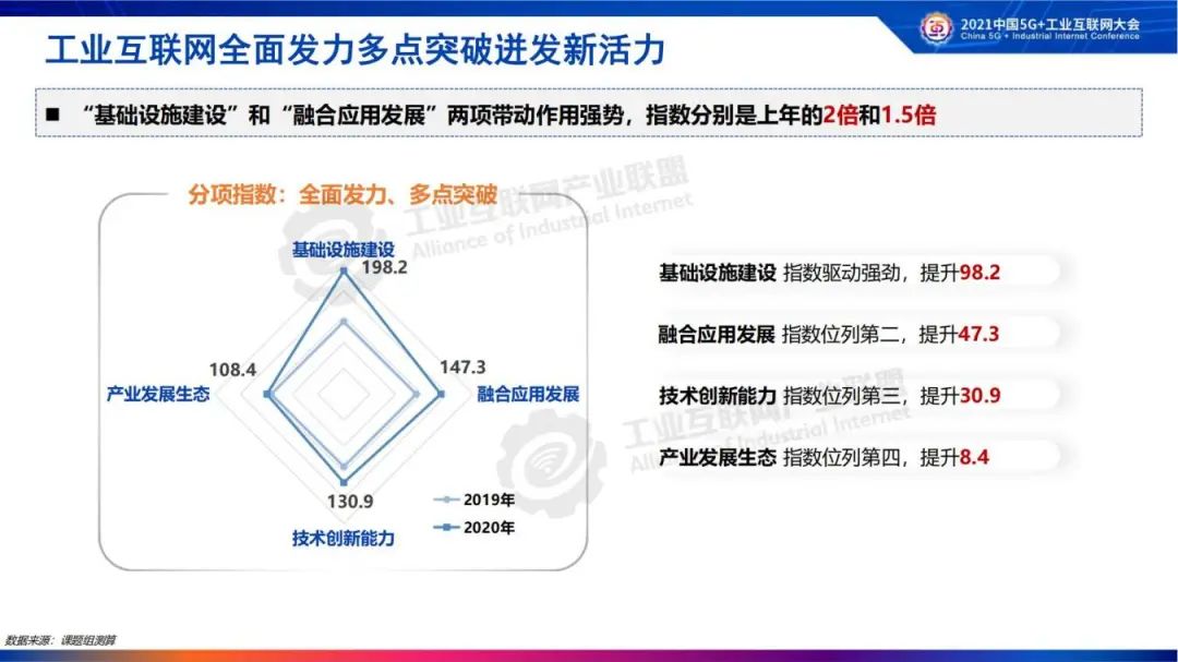 《报告》研究了工业互联网发展四类发展趋势。2020年工业互联网基础设施驱动强劲,指数提升98.2;融合应用成效显著,指数提升47.3;技术创新推进扎实,指数提升30.9;产业生态向荣向好,指数提升8.4。工业互联网全面、多点突破持续迸发新活力。