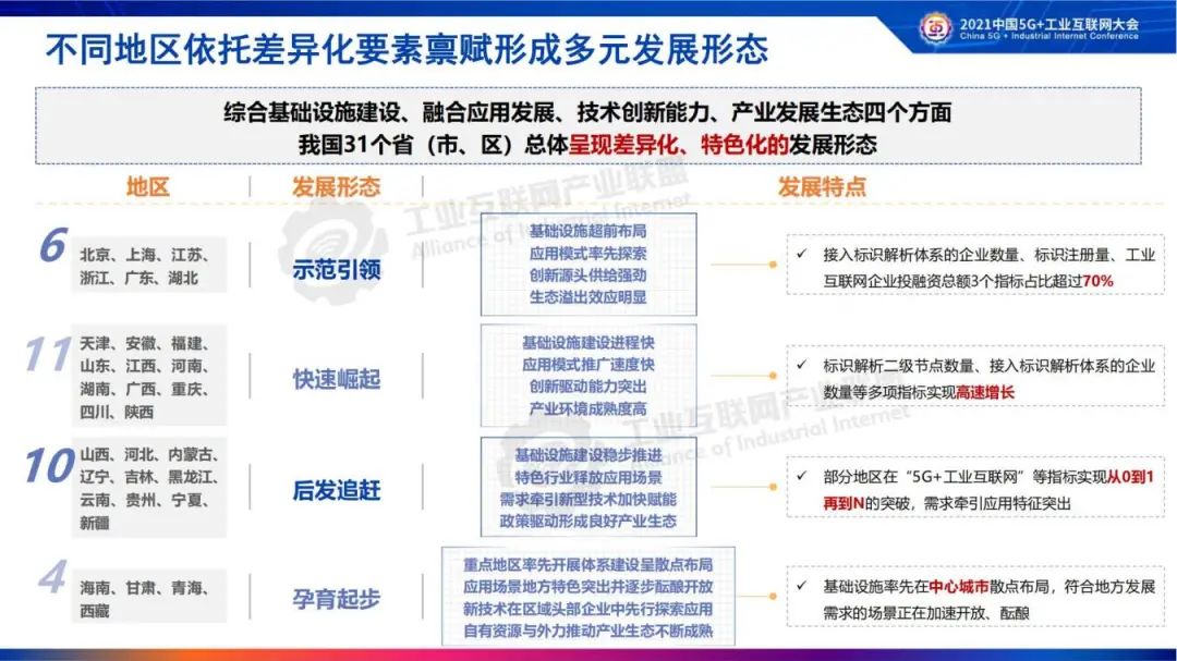 《报告》总结了工业互联网发展四种典型形态。全国31个省(市、区)依托差异化要素禀赋形成四种发展形态,分别为示范引领地区,呈现基础设施超前布局、应用模式率先探索、创新源头供给强劲、生态溢出效应明显的特点;快速崛起型地区,呈现基础设施建设进程快、应用模式推广速度快、创新驱动能力突出、产业环境成熟度高的特点;后发追赶型地区呈现基础设施建设稳步推进、特色行业释放应用场景、需求牵引新型技术加快赋能、政策驱动形成良好产业生态的特点;孕育起步型地区呈现重点地区率先开展体系建设呈散点布局、应用场景地方特色突出并逐步酝酿开放、新技术在区域头部企业中先行探索应用、自有资源与外力推动产业生态不断成熟的特点。