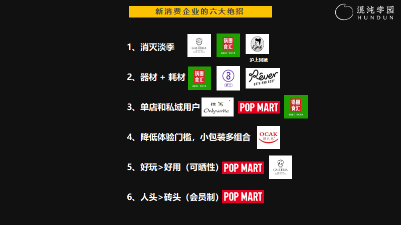 第一,消灭淡季。沪上阿姨的淡季是冬季,所以推出了一些适合冬天饮用的热饮,以确保一年四季销售业绩没有太大起伏。当然,还有很多企业一天内也有明显的淡旺季,小酒馆白天空着,咖啡店晚上空着,所以日咖夜酒的生意没有一天内的淡旺季。想办法消灭淡季,这是我们做企业、做投资要做的第一件事。第二,器材+耗材组合。素士不仅在电吹风前面加个精油喷头,还在冲牙器中放入一个冲牙胶囊,因为可以增加耗材。当然不单单是器材加耗材,而且是我的器材只能配我的耗材,这不仅是自己赚钱多,用户的体验也会很好。第三,单店和私域用户。移动互联网时代给了我们单店和私域的机会。这其中做得最极致是ONLY WRITE,它的创始人通过看混沌的课自学成才。ONLY WRITE开业第一个月,百多平米的店营业额做到了1000万。但这只是刚开业的数据,开业就是最高峰,它不可能永远做到的。但这没关系,即使后面数据掉一半,都是巨大的胜利。其实,今天我喜欢的新消费打法都是把我这个老零售人当年的思路倒过来了。单店私域的真正打法,不是由低到高,而是由终到始。第四,降低体验门槛,小包装多组合。现在加量不加价、4合1的打法都不行了,那应该怎么办呢?要降低门槛,小包装,多组合。我很喜欢拉面说,于是给我两个儿子推荐了一个我最喜欢的口味。但两个儿子觉得不好吃。我说等等,不止这一款,它们家还有五个口味,你们每个都试试。之后他们各自找到了一个钟爱的口味,从此我们家永远囤着两箱拉面说。我把这个故事分享给了拉面说的创始人二姐,人类对一个产品的喜好度不是最高级,而是比较级。所以,拉面说应该推一个多个口味的组合装,总有一款适合消费者。第五,好玩大于好用(可晒性)。产品做好后,团队需要先想象一张兼有用户和产品的图像。CUPSHE是个出海品牌。这家公司在做图片分析的时候拿出了两张图片:一张是一个女士在海边,穿着CUPSHE的泳装;另一张是这个女士在海边,穿着同样的泳装,手里还牵着一条狗。这两张图,大家愿意晒哪一张?同样的美女模特,同样的泳衣款式,同样的造型,缺一条狗就影响了一张图的可晒性。一个创始团队对产品可晒性的研究到这个程度,就可以放心地对他们进行投资。第六,人头大于砖头(会员制)。我们今天要数人头,不要数砖头,对人的经营要大于对产品的经营。所以如何建立起核心电子会员体系是需要格外关注的。
