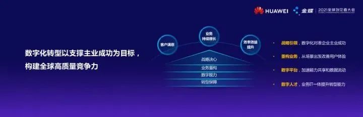 数字化转型的目的是支撑主业成功。华为所有的变革不是为了建造一个世界级的IT,而是要面向未来构建一个世界级的华为。现在很多的企业数字化转型或数字化,并不是业务战略驱动的。战略引领是发挥数字化价值的基础,构建高质量的企业竞争力是数字化转型的基础。要从业务场景出发,提升用户体验,重构业务的流程,重新规划业务的路径。在数字化的过程中,要重视数据的价值,要打造统一的数据平台,进行有效的数据治理,挖掘数据的价值,因为数据是企业这台机器里的最大效率变量。同时,要构建相应的数字化的保障体系,包括人、组织、能力,是数字化转型的关键。
