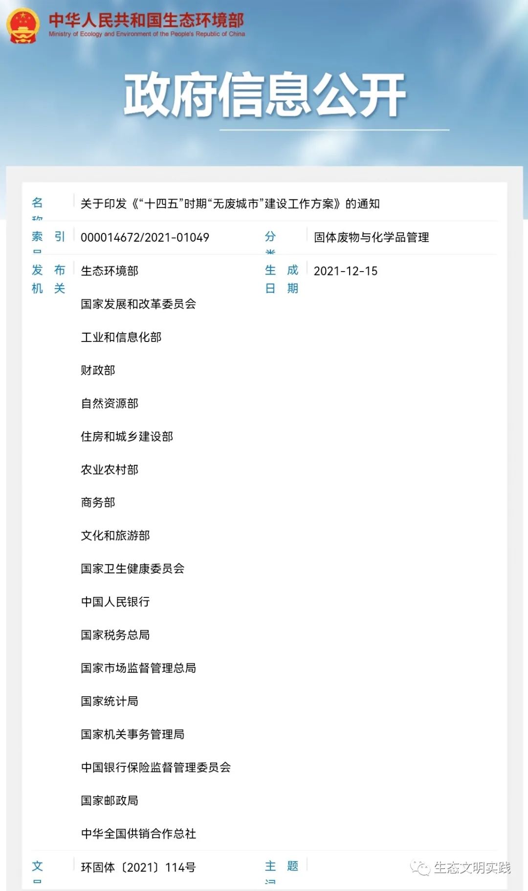 生态环境部等18部委联合印发《“十四五”时期“无废城市”建设工作方案》的通知