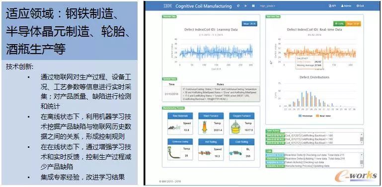 例如,可以利用机器学习技术,挖掘产品缺陷与历史数据之间的关系,形成控制规则,并通过增强学习技术和实时反馈,控制生产过程减少产品缺陷。同时集成专家经验,不断改进学习结果。利用机器视觉代替人眼,提高生产柔性和自动化程度,提升产品质检效率和可靠性。IBM开展了通过人工智能算法来分析质量问题,并找出改进措施的实践,取得了实效。