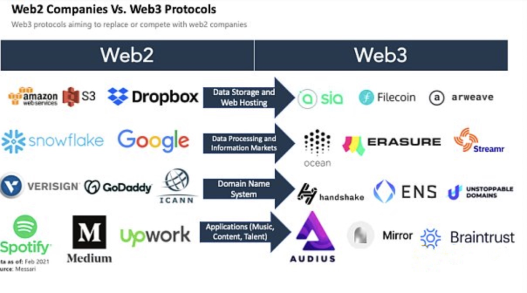 大批企业入局,包括以dydx为代表的分布式交易所及聚合,以Centrifuge为代表的资产证券化协议,以Axie为代表的具有链上资产的加密货币游戏,以Gitcoin为代表的工作协作平台,以Syndicate为代表的投资协作平台,以NBA Top Shot为代表的NFT相关平台……跨链/跨层#DeFi堆栈的100多个协议出现,从BNB的迅速崛起、随后MATIC的崛起到现在蓬勃发展的LUNA、SOL和DOT,可以看出以DeFi财富效应搭建的多链多层生态即将诞生,与大批企业一起助推一个多对多的新Web 3.0形成。这都不是Web 2.0主流企业,而是新时代企业。Meta也发布消息,将社交系统与Web 3.0 技术结合,Web 2.0 企业也开始面向Web 3.0 转型。就像Web 2.0企业(如谷歌)也和Web 1.0 企业(如美国在线American Online)不同,每一个新时代都有新领导者。