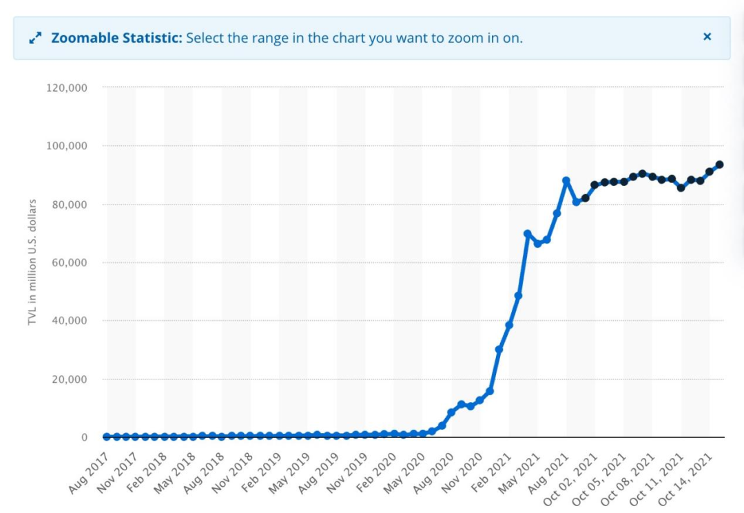 图1: DeFi 市场从2020年5月开始爆发(来自https://www.statista.com/)
