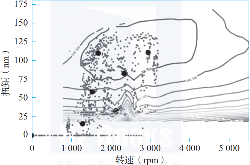 图2-11中顶部圈定的区域是试验标定的最优油耗区,图中的点是用户驾驶行为的油耗区。根据大数据分析,就可以调整发动机管控参数,实现面向实际用户驾驶的最优油耗。