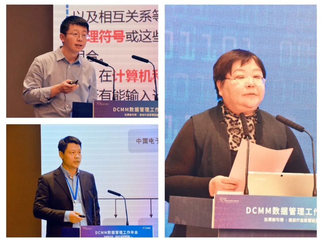 会上,中国电子信息产业发展研究院信息化与软件产业研究所所长姚磊(左上)解读了《“十四五”大数据产业发展规划》,数据要素市场促进会秘书长宾军志(左下)发布了《数据管理能力白皮书》和DCMM年度十佳案例,中国电子信息行业联合会副秘书长白丽芳(右)发布了2021年优秀评估机构和优秀评估报告范本。