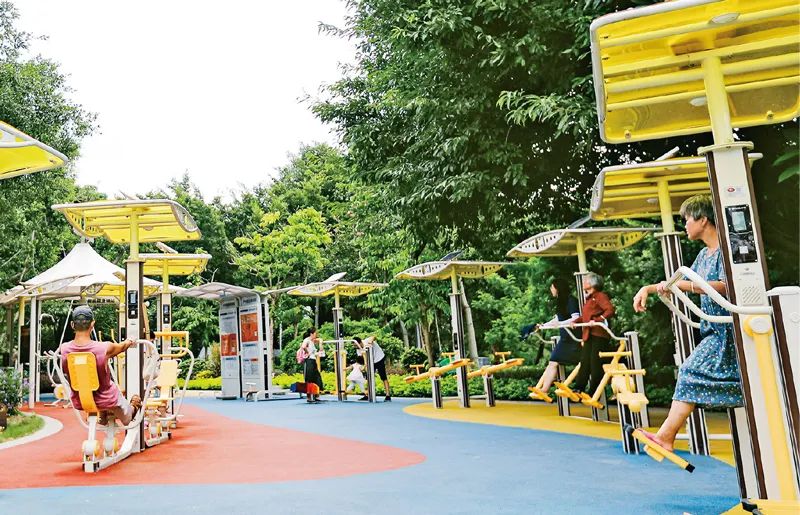 2021年,福建省福州市鼓楼区西河智慧体育公园向公众开放。公园内设置30台智能竞赛健身车、椭圆漫步机、体质监测器、智能健身驿站等智慧健身设备,采用太阳能供电,市民锻炼时可看到时间、步数、卡路里等数据,有效提升市民参与运动的互动感和热情度。图为市民正在体验智慧健身设备。中新社发 谢贵明/摄