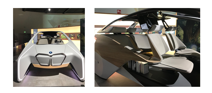 在调研中,海信集团总裁贾少谦先生把海信的战略凝练为:1x3xN战略,其中,“1”代表1个屏,指的是以屏幕为介质打通屏、网、云,构建未来的海信屏幕之网;“3”代表三域,指的是海信爱家、海信信我家、海信智通城三个平台,分别对应海信智慧家庭、智慧社区到智慧城市这三大领域的布局。“N”指的是全场景、全业态、全智能的智慧新生活解决方案。我认为,海信集团的战略从本质上来讲也是“软硬一体化模式”,这也正是黑海战略的本质所在。海信的战略意图是通过智能硬件直达用户,从而为用户提供数字服务,将智能设备与数字服务连接起来,为用户提供全场景的智慧生活解决方案。黑海战略具有普适性,不仅仅是中国的企业正在践行黑海战略,世界上其他国家的不少企业也正在实施黑海战略。下面,我以宝马为案例,给大家解读一下宝马的最新战略。下面这两张照片是我2019年底在德国慕尼黑的宝马博物馆拍摄的,我们可以看到宝马给我们展示的未来的汽车,俨然这辆汽车已经成为乘客们的“移动生活平台”,在车的后面还摆放着一些书本,乘客可以在车里阅读,甚至工作了。