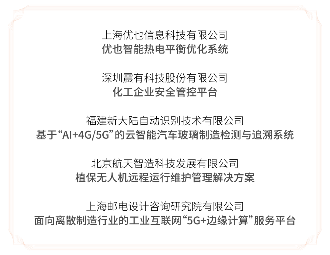 / 上海优也信息科技有限公司 /优也智能热电平衡优化系统在广东某纺织企业,有3台锅炉和汽机给下游主生产提供蒸汽和电力,同时外购电力满足生产要求。降本增效提质一直是该企业的工作重心。通过应用优也智能热电平衡调度系统和锅炉智能管家系统后,该企业可以精准预测下游用能需求,智能调节机组负荷,实现节降年化成本预计500-800万元,年化燃煤和电力成本节降率为2%-4%,锅炉效率提升0.5%。/ 深圳震有科技股份有限公司 /化工企业安全管控平台震有科技化工企业安全管控平台以“互联”和“安全”为出发点,通过自研核心通信技术筑基互联通达的网络底座。利用多年来公共安全领域数字建设经验构建上层安全管控应用,为化工企业提供最具价值的智能安全管控服务。方案具有通信网络全域覆盖,安全、降本、增效一站式实现,不同企业“量体裁衣”三大价值点。该方案包括监测预警、能效管理、应急救援、安全管理、封闭管理、一图全览6大上层应用。/ 福建新大陆自动识别技术有限公司 /基于“AI+4G/5G”的云智能汽车玻璃制造检测与追溯系统新大陆与业界知名汽车玻璃生产厂商进行深度技术合作开发的“AI+4G/5G”的云智能工业制造检测与追溯系统,能够准确检测到汽车玻璃光学缺陷,可确保高质量玻璃部件产量,满足行业的严格要求,企业可避免进一步加工缺陷产品并优化工艺,可以确保快速实现投资回报。该方案是集工业相机、工控机、光学系统、自动化控制系统、数据信息化系统于一体的综合系统,在汽车玻璃行业、光伏玻璃行业、液晶显示屏行业都具有较高的推广价值。/ 北京航天智造科技发展有限公司/植保无人机远程运行维护管理解决方案方案应用价值包括:一是实现无人机远程全生命周期监管服务。二是实现全国无人机跨区飞防作业。三是大大降低售后成本。四是降低维修时间和维修成本,提高作业效率。本解决方案已经形成了无人机设备管理服务、作业任务管控服务、跨区调度服务、远程预测性维护服务、“AR+5G”远程指导服务、微晶码+标识解析产品溯源服务等全时域综合服务能力。目前业务覆盖区域遍布河南、河北、内蒙古、新疆、宁夏、山东、甘肃、湖南、黑龙江、安徽、江苏等10多个省市自治区。/上海邮电设计咨询研究院有限公司/面向离散制造行业的工业互联网“5G+边缘计算”服务平台通过该服务平台,企业通过自主操作即可实现内网与相关边缘应用的融合,增加产线柔性和可持续升级能力。通过平台还可为制造企业提供技术咨询、中小企业培训服务,进一步推动行业解决方案和应用模版的普及。平台目前在国内家电制造龙头企业进入实施应用,该项目有助于制定相关行业标准草案或具有影响力的产业联盟团体标准草案,在企业和工厂中进行试验验证,逐步建立健全“5G+边缘计算”标准体系,为“5G+边缘计算”技术的应用推广提供标准支撑。工业互联网年度卓越产品
