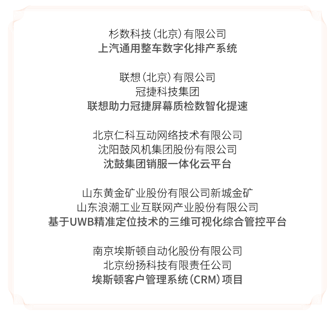 / 杉数科技(北京)有限公司 /上汽通用整车数字化排产系统上汽通用整车数字化排产系统实现了整车精准排序,突破单一序列的限制实现分车间排序,自定义平准逻辑使得物料需求更平滑。通过平准化排产达到货量均衡,提升了物流资源规划精准度,降低了运输车辆的投入,车次运输效率提升10%;分车间排序,定货与实际消耗一致,有效避免溢库&紧急拉动,日均管理费用降低7%。年化收益将超数百万元。该项目为整个汽车行业数字化转型也提供优化新思路。/ 联想(北京)有限公司、冠捷科技集团 /联想助力冠捷屏幕质检数智化提速在冠捷项目中,联想提供工控机ECI 430+ThinkStation P920 ,采用边缘云融合的架构,多台工控机采集不同产线的图像,汇集到一台ThinkStation做算法分析,分享算力。缺陷识别方面,联想为冠捷实现两大类缺陷检测:一类是常规的暗点/黑点/彩点、线条、黄斑等;第二类则是未知缺陷检测,最大可能控制漏检率。而为了满足新增类型的缺陷,联想将自适应技术加入算法中,建立了端到端的数据管理系统,积累历史数据及构建完整的缺陷知识图谱,对不良风险进行分析、预测预警、回溯。实现产线质量的持续提升及精细化控制。人力成本节省50%,效率和准确率提升30%。/ 北京仁科互动网络技术有限公司、沈阳鼓风机集团股份有限公司 /沈鼓集团销服一体化云平台在销售易销服一体化云平台方案支撑下,沈鼓集团构建了以客户为中心的营销管理平台、项目管理平台、客户服务资产平台、知识储备及员工提能平台、社交型客户服务平台、营销及服务一体化的客户关系管理平台。通过销服一体化云平台,沈鼓集团实现了产品“销售-服务-二次销售”的信息闭环,以及围绕一个项目,构建“市场-销售中心-项目部-客服中心”的管理闭环。一体化的信息与管理协同,以及产品、项目全生命周期管理的实现,将帮助沈鼓集团实现二次增长。/ 山东黄金矿业股份有限公司新城金矿、山东浪潮工业互联网产业股份有限公司 /基于UWB精准定位技术的三维可视化综合管控平台在浪潮云洲工业互联网平台支撑下,山东黄金新城金矿基于UWB(Ultra Wide Band,UWB)精准定位技术,建成了基于UWB精准定位技术的井下人员三维可视化安全管理系统。该项目的实施应用,将企业的安全生产与经营管理业务流程数字化并加工成新的信息资源,及时准确地提供给各层次的管理者,使其及时掌握动态业务中的有效信息,以作出有利于生产要素组合优化的决策,使企业资源合理配置。该系统自投入运行以来,定位准确,运行稳定,对井下人员的安全等智能化管理具有重要意义。/ 南京埃斯顿自动化股份有限公司、北京纷扬科技有限责任公司 /埃斯顿客户管理系统(CRM)项目埃斯顿携手纷享销客共同搭建CRM管理平台,实现全员在线化、组织在线化。通过CRM系统的应用,一是可以通过营销一体化的精细化线索管理、全方位的客户360°画像,提升客户培育与转化效率;二是实现全渠道获客数据归集,建立企业线索库、私域流量池;三是以客户为中心,实现客户管理全景化;四是基于BI分析平台,通过深度融合营销、销售、服务、渠道多种CRM业务场景,无缝集成PaaS平台数据结构与数据权限,用户可以随时随地洞察数据,支撑制定科学决策,洞悉决策执行效果,形成PDCA管理闭环。工业互联网年度创新方案