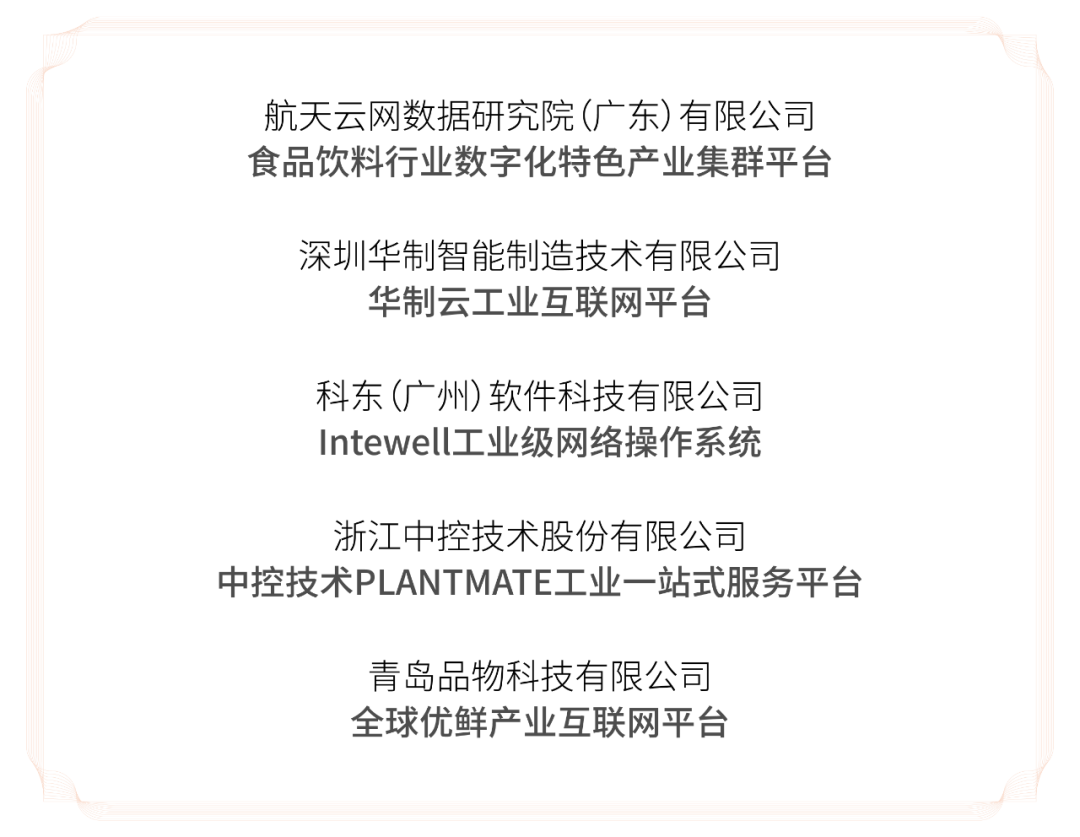 / 航天云网数据研究院(广东)有限公司 /食品饮料行业数字化特色产业集群平台紧密围绕企业提升生产效率、降低运营成本、加强质量管控三个纵向维度的共性问题,从生产链条、运营链条两个横向维度打造行业普适性的数字化转应用产品和服务能力,形成“三纵两横”的解决方案能力集,覆盖食品饮料工业企业数字化转型中涉及的设备管理、生产过程管理、质量管理、供应链管理、能源管理、高可靠质量溯源等全部业务场景。/ 深圳华制智能制造技术有限公司 /华制云工业互联网平台积累了大量的工业应用组件和工业数据分析模型,形成了高可配、快部署、易运维、强稳定的独特优势,可以针对不同行业快速完成应用开发和实施部署。已服务装备制造、能源化工、汽车零部件等行业,与潞安集团、天原集团、甘肃稀土、国投生物、大族激光、中国中车、太原重工、玲珑轮胎、山西华翔、云内动力等各行业领域头部客户达成合作,项目成果丰硕,入选了多个国家级、省市级试点示范。/ 科东(广州)软件科技有限公司 /Intewell工业级网络操作系统基于微内核架构,具备软件定义控制、高实时(us级响应)、高可靠、自主可控、多业务承载、软硬件解耦等一系列特性,实现了控制、计算、网络、云服务技术的融合统一。Intewell虚拟化操作系统通过工信部电子五所严格的功能、性能测试及源代码自主率扫描测试。测试报告结论说明内核及部分关键模块源码私有代码率达100%。目前已广泛应用于轨道交通、制造、能源、电力、机器人等多个领域。/ 浙江中控技术股份有限公司 /中控技术PLANTMATE工业一站式服务平台中控技术PLANTMATE?是高端服务运营品牌,创建于2019年,源于中控在服务领域的业务延伸创新,是中控·SUPCON 旗下子品牌。PLANTMATE是面向工业企业的工业一站式服务平台,包含五大板块“线上商城”“联储联备”“需求派单”“知识培训”“工业SaaS”。其中,中控SaaS产品“中控智能工厂云平台”提供覆盖能源管理等生产制造核心业务场景的200多个工业APP。/ 青岛品物科技有限公司 /全球优鲜产业互联网平台平台主导国内跨境冷链物流产业数字化转型,致力于打通海外工厂到国内客户的全产业链条,实现物流可追踪、货源可追溯,为客户提供集进口、航运、报关、仓储、物流、分销、金融等全链条一站式解决方案。已服务上游客户已覆盖全球5大洲、42个国家、330余家屠宰厂,上千个生鲜供应商。下游客户覆盖全国16个省180个城市、主要客户4000家,包括大型冻批加工渠道、超市门店渠道、新零售渠道、餐饮连锁渠道等。工业互联网年度优秀案例