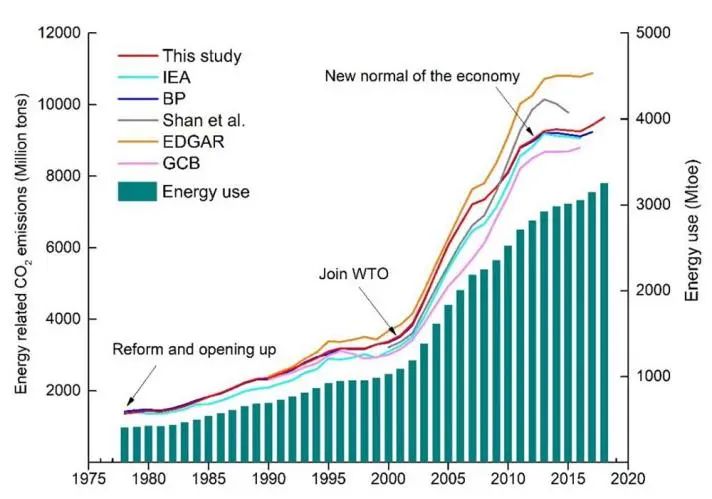 1978-2018年中国能源活动碳排放量变化,图源:吕永龙研究员团队