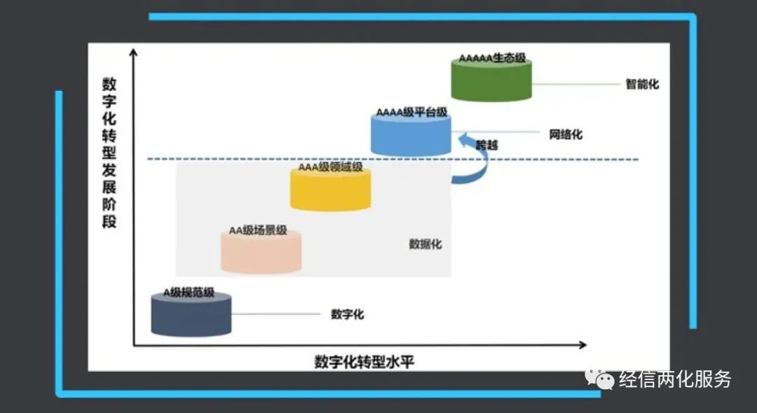 企业数字化转型的5个发展阶段两化融合管理体系,是我国首个自主研制、实现大范围推广并正在向国际输出的管理体系标准。两化融合管理体系结合了几十年来我国企业信息化发展历程中积累的技术应用成果和管理创新经验,逐步探索形成的一套全面服务企业数字化转型的“中国方案”;是我国首个覆盖两化融合全局、全要素、全过程的管理体系标准,作为企业构筑信息时代核心竞争能力的体系方法,经过7年的大范围普及推广和深入应用,两化融合管理体系不断丰富完善,已经形成一系列普适易用、相互配套的标准体系,成为国家和地方省市推进信息技术和实体经济深度融合的重要抓手,其评定结果被作为评判企业综合发展潜力的重要依据。2021年,两化融合管理体系进入贯标2.0(升级版)时代。