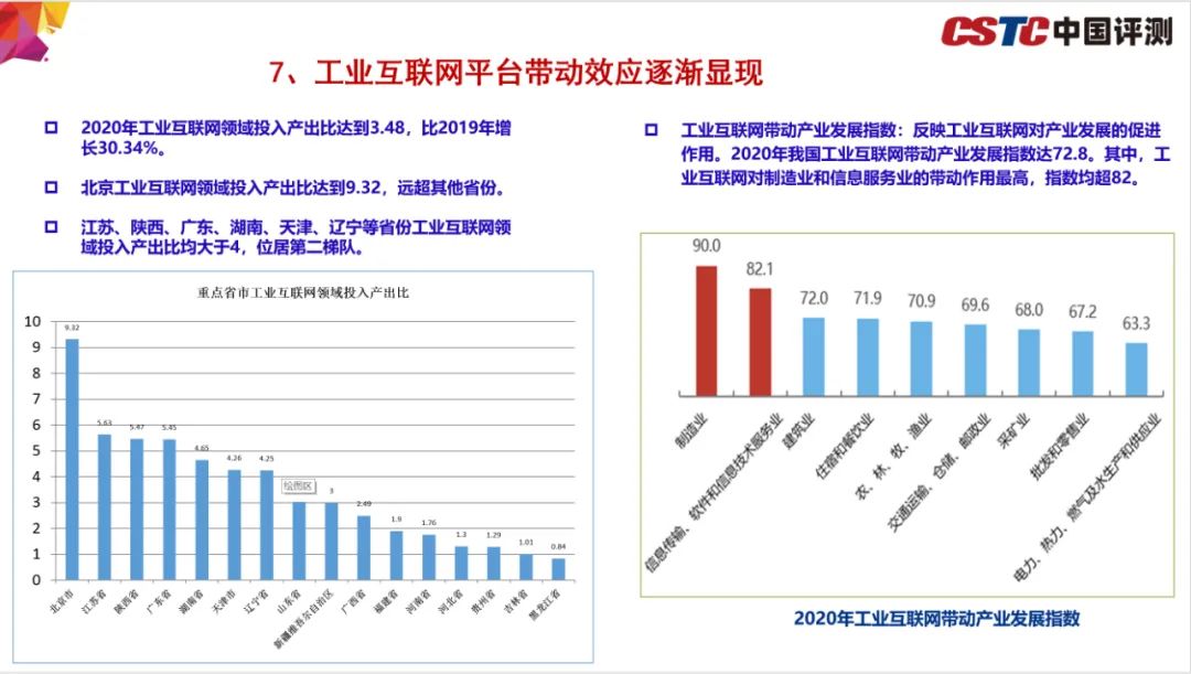 第七个趋势,工业互联网平台带动效应逐渐显现。通过监测分析公共服务平台,中国软件评测中心计算了一个数据,即近三年我们国家工业互联网领域投入产出比的情况。从这两年来看,工业互联网领域的投入产出比一直在增长,而且增长的幅度都超过30%。由此说明工业互联网领域投入产出比的空间和发展潜力非常大。同时中国软件评测中心也对各区域的工业互联网投入产出比进行了测算。从测算的结果来看,北京达到了9.32,排在第一位。其次是江苏、陕西、广东、湖南、天津、辽宁等这些省市,工业互联网领域投入产出比也比较大,都高于4.0,位于第二梯队。