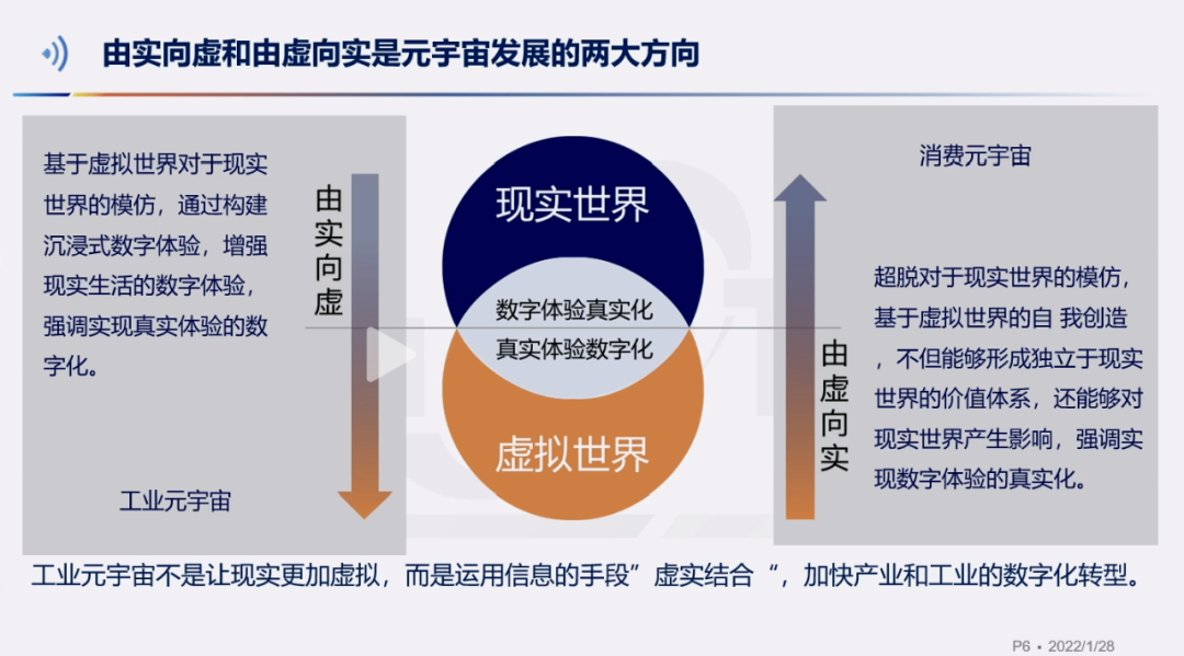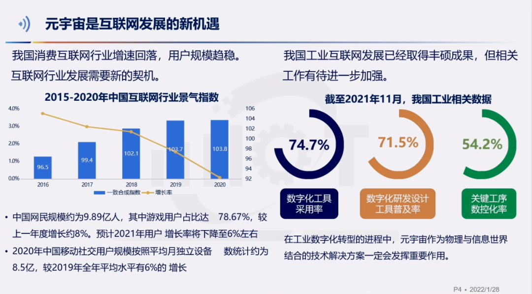 专家精彩观点:元宇宙不是一种技术,而是一组技术概念的集合,它基于互联网而生,是数字信息高度发展的产物。元宇宙是在两个背景下出现的,一个是线下场景的数字化,主要体现在消费互联网领域的社交和娱乐上,另一个是产业和工业的数字化转型需求,也就是工业元宇宙。目前,我国消费互联网行业增速回落,用户规模趋稳。2020年我国网民的数量约为9.89亿人,其中游戏用户就占比了78%以上,移动社交用户的独立设备数是8.5亿,从社交和游戏出发元宇宙将为消费互联网行业发展需要新的契机。另一方面,我国是全球唯一一个具备联合国认可的所有工业门类的国家,具有良好的工业基础和内需;根据工信部发布的最新数据,我国在工业生产中数字化工具的采用率、数字化研发设计工具的普及率和关键工序的数控化率与国际先进水平还有很大差距,虽然我国工业互联网发展已经取得丰硕成果,但相关工作有待进一步加强。在工业数字化转型的进程中,元宇宙作为物理与信息世界结合的技术解决方案一定会发挥重要作用。工业元宇宙主要有两个方面的重要工作。一方面是工业元宇宙需要强化物理世界与信息世界的联动,保障信息为物理世界服务才能真实推动工业的数字化转型。另一方面是完成三个层面的信息整合,一是企业信息垂直整合,括设备信息、工控系统、工业软件等,二是生产链条信息整合,包括设计、研发、制造、仓储、销售等环节信息。三是端到端信息整合,打通万物互联的信息通路。下一步要从三个方面开展工作:一是要启动白皮书的编制,依托工业互联网产业联盟,正式立项《工业元宇宙 初探》白皮书,聚焦关键问题,总结研究成果,从工业元宇宙的技术框架、关键技术、重点应用等方面撰写。二是要聚焦工业元宇宙的核心问题,以关键技术研究为主线,研制关键技术标准和行业应用标准。三是要结合数字化转型需要推动工业元宇宙应用的落地,开发工业元宇宙场景典型方案,同时加强外部合作,开展应用试点。