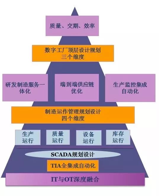 数字化工厂的规划设计与落地,需要通过三个维度来顶层设计,首先是从供应链优化的维度,其次是研发制造服务一体化维度,即研发的产品要智能化。最后是生产现场精益生产集成自动化维度。生产运作从四个维度即生产运行、质量运行、设备运行、库存运行。工业控制实现SCADA/HMI/DCS数字网络控制实现IT与OT的深度融合。