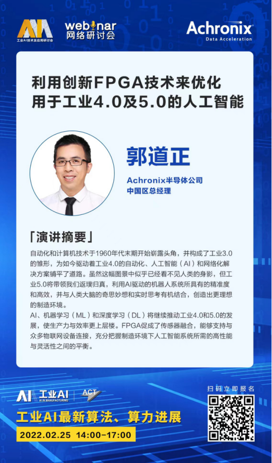 01活动一:《工业AI》杂志举办的“工业AI最新算法、算力发展现状与展望”网络研讨会会议日期及时间:2022年2月25日,下午3:00-3:45演讲题目:利用创新FPGA技术来优化用于工业4.0及5.0的人工智能演讲者:郭道正(Dawson Guo)郭道正现担任Achronix中国区总经理,拥有超过20年的半导体行业经验。在近20年中,郭先生一直专注于推动FPGA技术与通信、计算、汽车和工业自动化等应用市场结合,以实现系统级和芯片级的创新;在加入Achronix前,郭先生曾在Microsemi(Actel)工作13年,担任中国区FPGA业务负责人。他毕业于上海交通大学电子工程系通信工程专业。如希望参加此次活动,请扫描以下图片上的二维码。