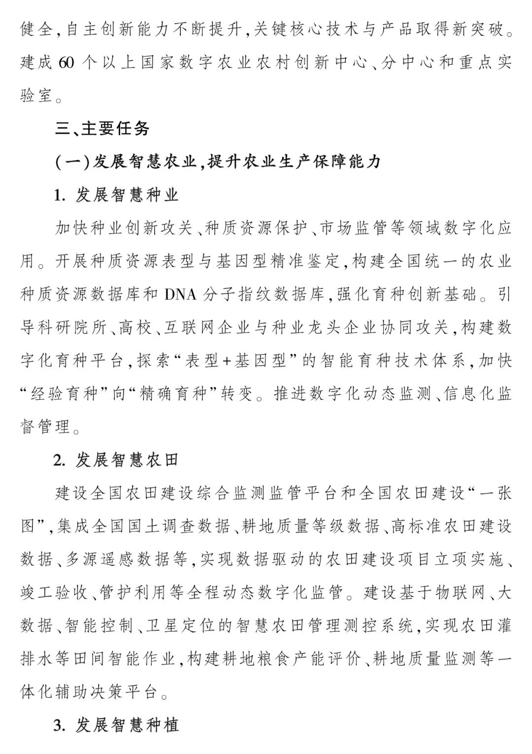 答:在“十三五”时期实施的数字农业项目基础上,针对农业生产管理面临的迫切需求和关键短板,以提高生产效率和管理效率为两大核心目标,《规划》设立了3大工程。一是国家数字农业创新应用基地建设工程。“十四五”期间,在全国建设种植业、设施农业、畜牧业、渔业、种业等5类国家数字农业创新应用基地,建立贯通信息采集、分析决策、作业控制、智慧管理等各环节的智慧农业集成应用体系。二是国家农业农村大数据平台建设工程。充分利用现有软硬件基础,改造提升“农业农村云”基础设施,升级完善农业农村数据采集系统,建设农业农村数据“一张图”和大数据分析通用系统,形成统一的国家农业农村大数据平台。三是智慧农业技术创新工程。面向农业农村信息化应用创新重大需求,建设一批国家数字农业农村创新中心和农业农村部重点实验室,开展基础共性、战略性、前沿性智慧农业技术研究,重点研发具有自主知识产权的智慧农业创新技术产品。