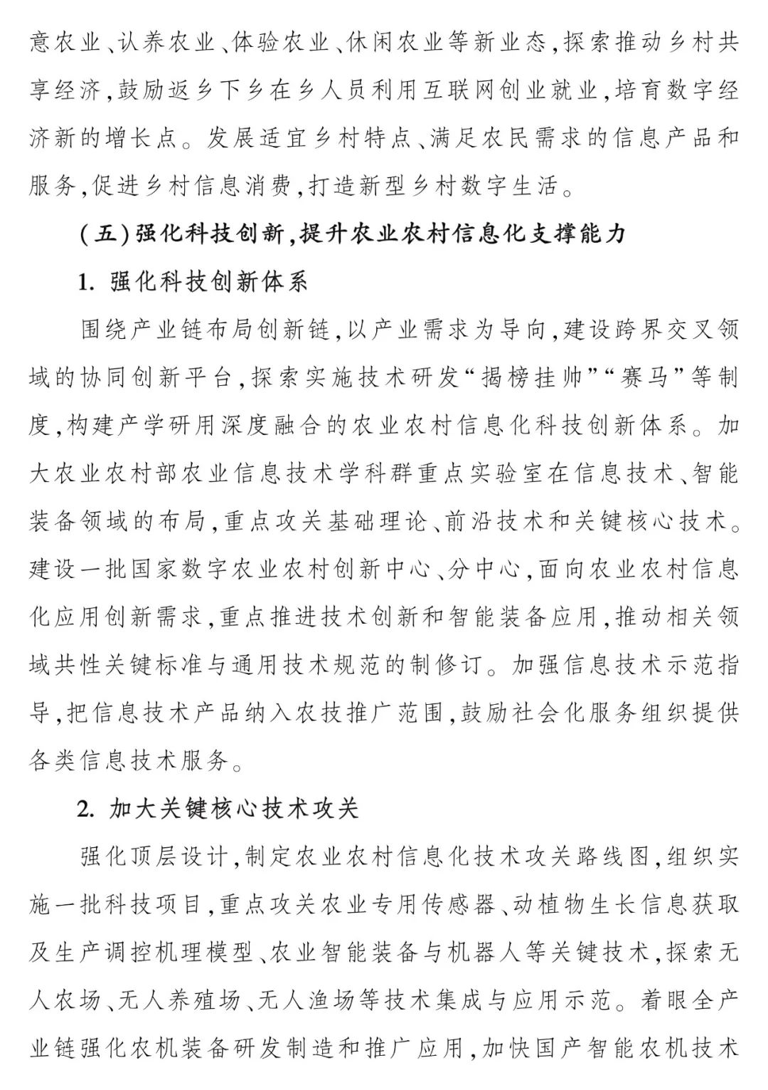 一是发展智慧农业,提升农业生产保障能力。这是“十四五”时期农业农村信息化发展的主攻方向,重点是聚焦行业发展需求,提升农业生产效率。从智慧种业、智慧农田、智慧种植、智慧畜牧、智慧渔业、智能农机和智慧农垦七个方面进行全面突破。二是推动全产业链数字化,提升农产品供给质量和效率。重点推进农业生产经营主体互联网融合应用,加速农产品“加工-仓储物流-电商-追溯”各环节数字化改造升级,形成农业全产业链信息流闭环。三是夯实大数据基础,提升农业农村管理决策效能。重点建立健全农业农村数据资源体系,深入推进农业农村大数据发展应用,推动数字政务能力建设,实现用数据说话、用数据决策、用数据管理、用数据创新。四是建设数字乡村,缩小城乡数字鸿沟。重点是强化乡村信息基础设施,推进乡村治理数字化,发展乡村信息服务,培育乡村数字经济,全面提升数字乡村发展水平。五是强化科技创新,提升农业农村信息化支撑能力。重点是强化科技创新体系,加大关键核心技术攻关,壮大农业农村信息化产业体系。
